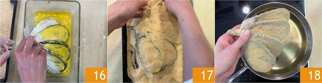 Puis trempez-les dans l'œuf battu 16 et enfin, recouvrez-les de chapelure 17. Faites maintenant chauffer l'huile de friture dans une casserole et, une fois qu'elle aura atteint 180°, plongez l'aubergine panée 18.