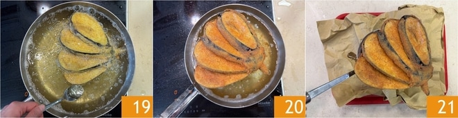 Faites frire environ 7 minutes de chaque côté 19, jusqu'à ce qu'elles soient dorées. Égouttez-les 20 sur du papier absorbant pour éliminer l'excès d'huile 21.
