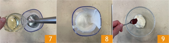 Commencez à mixer avec un mixeur plongeant en versant l'huile en filet 7 jusqu'à obtenir une consistance similaire à celle de la mayonnaise 8. Transférez la sauce dans une poche à douille et mettez au réfrigérateur. Passez maintenant à la sauce au piment : dans un bol, mélangez la mayonnaise avec la pâte de piment 9.
