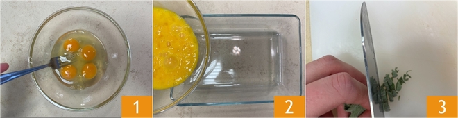 Pour préparer la côte de veau aromatique à la milanaise, commencez par la panure : battez les œufs 1 et versez-les dans un plat 2, puis hachez les feuilles de sauge au couteau 3.