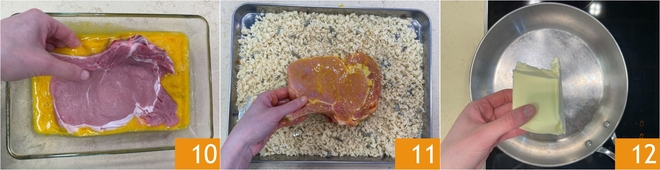 Prenez maintenant les côtelettes de veau et pressez-les légèrement avec les mains ; si nécessaire, incisez le cartilage le long du bord pour éviter qu'elles ne se rétractent à la cuisson. Passez les côtelettes d'abord dans l'œuf 10 puis dans la panure 11, en veillant à bien les recouvrir des deux côtés. Laissez reposer les côtelettes panées environ 10 minutes, ainsi la panure adhérera bien à la viande. Au bout de ce temps, faites fondre le beurre dans une grande poêle 12.