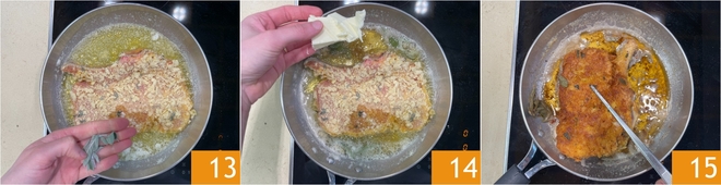 Quand le beurre commence à crépiter, déposez la côte dans la poêle. Aromatisez avec les feuilles de sauge restantes 13 et faites cuire à feu moyen pendant environ 4-5 minutes. Ajoutez le beurre restant pendant la cuisson, afin d'en abaisser la température et d'éviter qu'il ne brûle 14. Une fois bien dorée, retournez la côte de l'autre côté et poursuivez la cuisson encore 4-5 minutes 15.