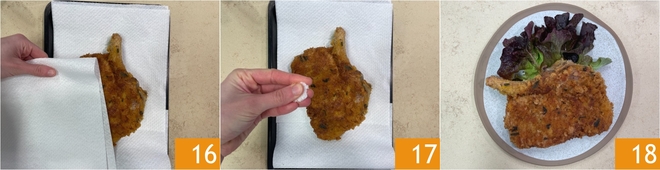 Quand vous aurez obtenu une belle coloration uniforme et croustillante, égouttez la côte sur du papier absorbant, tamponnez-la bien 16 et laissez reposer pendant 4 minutes 16. Enfin, salez selon votre goût 17. Votre côte de veau aromatique à la milanaise est prête à être servie 18 !