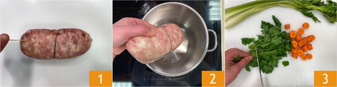 Pour préparer le cotechino en cocotte-minute, il vous faut un cotechino frais, pas un de ceux précuits. Percez-le et mettez-le dans la cocotte-minute 2. À ce stade, occupez-vous de laver et couper grossièrement le céleri, les carottes et le persil 3. Si vous préférez, vous pouvez ne pas éplucher les carottes.
