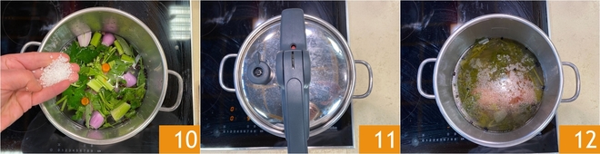 Ajoutez le sel 10 et fermez la cocotte avec son couvercle 11. Allumez à feu moyen et, quand elle commencera à siffler, baissez le feu et laissez cuire 35 minutes. Une fois ce temps écoulé, éteignez le feu et soulevez la soupape pour libérer la vapeur ; quand elle ne sera plus sous pression, vous pourrez ouvrir le couvercle 12.