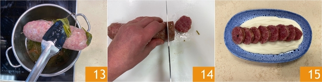 Sortez le cotechino de l'eau 13 et placez-le sur une planche à découper. Retirez éventuellement la ficelle 14 et coupez-le en tranches. Servez votre cotechino en cocotte-minute accompagné de lentilles ou de purée 15!