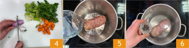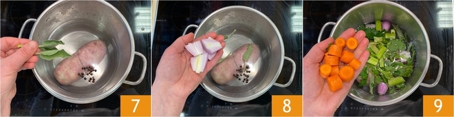 Ajoutez les feuilles de sauge 7, l'échalote 8, le céleri, le persil et les carottes 9.