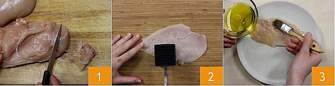 Pour préparer la côtelette palermitaine, commencez par la viande. Si vous utilisez de la poitrine de poulet, retirez soigneusement les parties les plus grasses 1 et l'os central. Ensuite, avec un couteau bien aiguisé, découpez des tranches d'environ 1 centimètre. Puis, battez-les avec un marteau à viande pour attendrir la viande et réduire son épaisseur 2. Transférez ensuite les tranches de viande sur une assiette, badigeonnez-les d'huile des deux côtés et mettez-les de côté pendant que vous poursuivez la préparation 3. Si vous préférez, vous pouvez utiliser de la viande de bœuf, en choisissant les tranches les plus tendres comme celles de rond de gîte, faux-filet ou pièce ronde, selon vos goûts.