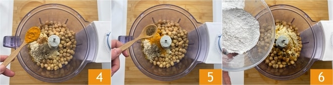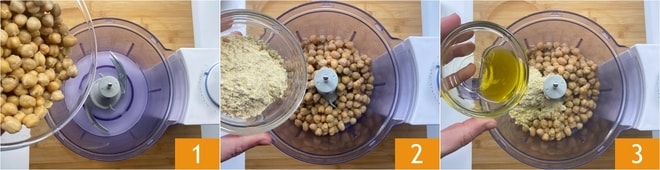 Dans le bol d'un mixeur, mettez les pois chiches préalablement rincés et égouttés 1, la farine de pois chiches 2, l'huile 3, le sel et le poivre.