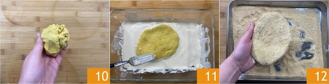 Prélevez maintenant des morceaux de pâte d'environ 120 g et formez une boule 10, puis écrasez-la entre vos mains pour lui donner la forme d'une côtelette. Passez-la d'abord dans la pâte 11 puis dans la chapelure 12.