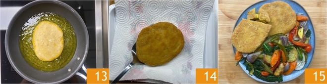 Faites frire chaque côtelette dans une poêle avec une bonne quantité d'huile 13, jusqu'à ce qu'elle soit bien dorée. Il faudra 2-3 minutes de chaque côté ; aidez-vous d'une spatule pour la retourner et ensuite l'égoutter sur du papier absorbant 14. Continuez ainsi jusqu'à ce qu'elles soient toutes cuites et servez vos côtelettes de pois chiches avec un accompagnement de légumes 15.