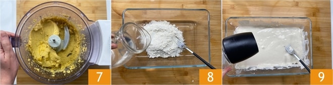 Refermez le tout et mixez très soigneusement 7. Au début, le mélange semblera très sec et poudreux, mais en continuant de mixer, il s'épaissira et vous obtiendrez une préparation malléable. Vous pouvez éventuellement ajouter un peu plus d'huile ou une cuillère d'eau, si elle est trop compacte. Préparez la pâte : dans un bol, versez la farine et l'eau. Mélangez bien avec une fourchette 8 et assaisonnez de sel 9.