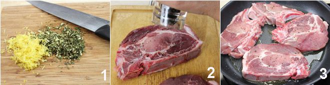 Pour préparer les côtes de porc à la bière et aux herbes aromatiques, commencez par nettoyer et hacher l'ail, les herbes aromatiques et le zeste de citron 1. Disposez les 4 côtes sur une planche à découper et salez et poivrez-les 2 de chaque côté. Faites chauffer l'huile dans une poêle et faites cuire la viande 5-6 minutes de chaque côté 3.