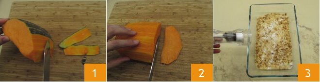 Pour préparer les côtelettes de potiron, commencez par éplucher ce dernier, vous devriez obtenir 450 g de pulpe 1. Coupez-la en tranches d'environ un demi-cm d'épaisseur 2. Passez ensuite à la panure. Dans un bol, versez la chapelure grossièrement moulue, le fromage, puis ajoutez le sel et le poivre 3,