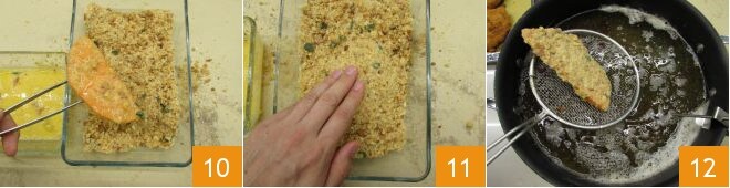 et encore dans le mélange de chapelure 10. Pressez à nouveau pour que cela adhère bien et répétez le même processus pour toutes les autres tranches 11. À ce stade, vous pouvez passer à la cuisson : chauffez l'huile à 165° et immergez 1 ou 2 morceaux à la fois 12.