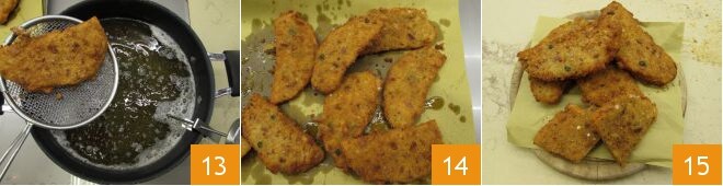 Après environ 2 minutes, les côtelettes seront bien dorées 13, égouttez donc les premières sur du papier absorbant 14 et poursuivez avec toutes les autres. Vos côtelettes de potiron sont prêtes, servez-les bien chaudes 15 !