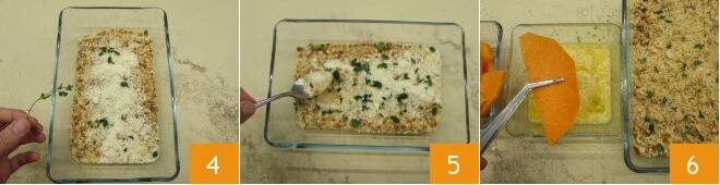 puis effeuillez l'origan frais 4 et mélangez le tout 5. À ce stade, vous pouvez paner les tranches de potiron. Passez-les d'abord dans les œufs battus 6,