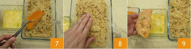 puis dans le mélange de chapelure 7 et pressez avec les mains pour bien faire adhérer la panure 8. Ensuite, recommencez en repassant la côtelette d'abord dans les œufs 9