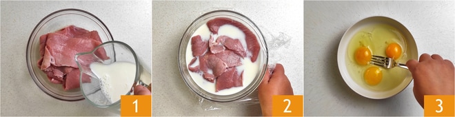 Pour préparer les côtelettes au four, commencez par mettre les tranches de viande dans un grand bol et versez le lait par-dessus 1. Couvrez avec un film plastique 2 et laissez reposer au réfrigérateur pendant 30 minutes. Pendant ce temps, cassez les œufs dans une assiette, ajoutez le sel et battez-les avec une fourchette 3.