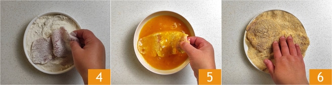 Une fois le temps de marinade écoulé, égouttez les tranches de viande du lait et passez-les dans la farine 4, en les secouant doucement pour enlever l'excès. Ensuite, plongez-les dans les œufs battus 5 et enfin recouvrez-les de chapelure 6.