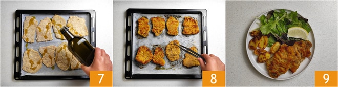 Disposez les tranches sur une plaque recouverte de papier sulfurisé, assaisonnez de sel et arrosez les deux côtés d'huile 7. Faites cuire dans un four statique préchauffé à 200° pendant 30 minutes, sur la grille du milieu, en retournant les côtelettes à mi-cuisson 8. Vos côtelettes au four sont prêtes à être servies, peut-être accompagnées d'une salade, d'une tranche de citron et de pommes de terre au four 9 !