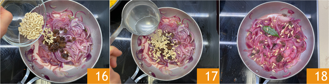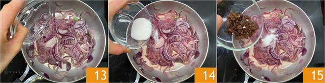À ce stade, ajoutez le vinaigre 13, le sucre 14 et les raisins secs 15.