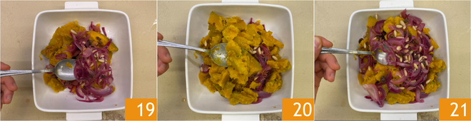 À ce stade, transférez à la fois la courge et l'oignon dans un plat allant au four, en alternant les couches 19 20 21. Placez au réfrigérateur et laissez reposer entre 6 et 12 heures, pour bien amalgamer les saveurs.