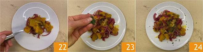 Après le temps de repos, dressez les assiettes 22 et complétez avec du persil haché 23. Votre courge en saor est prête à être dégustée 24 !
