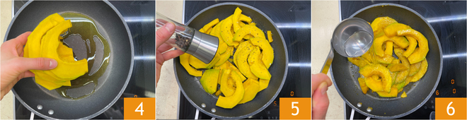 Dans une poêle, chauffez un filet d'huile, puis ajoutez la courge 4 et assaisonnez avec du sel et du poivre 5. Faites cuire à feu moyen pendant 2 minutes, puis ajoutez une louche de bouillon de légumes dans la poêle 6.