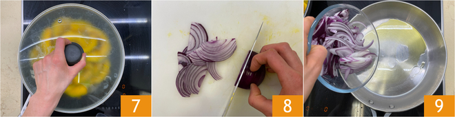 Couvrez avec un couvercle 7 et continuez la cuisson à feu moyen-doux pendant environ 10 minutes. Pendant ce temps, épluchez et émincez finement l'oignon 8. Dans une autre poêle, versez un filet d'huile avec les oignons 9.