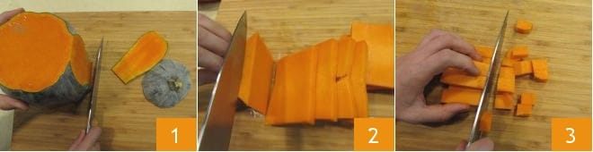 Pour préparer la courge gratinée, commencez par nettoyer la courge en retirant la peau extérieure avec un couteau 1. Coupez la courge ainsi nettoyée en tranches 2, puis en lanières et enfin en cubes d'environ 1 cm 3.