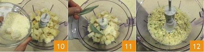 Transférez les cubes de pain rassis dans un mixeur, ajoutez le Grana Padano râpé 10 et les feuilles de sauge 11 et mixez brièvement jusqu'à obtenir une consistance assez grossière 12.