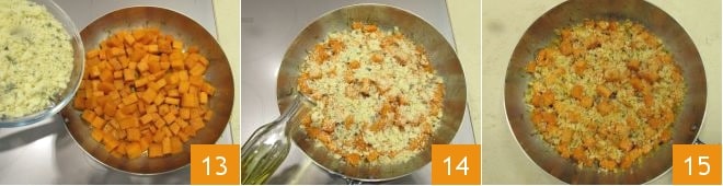Parsemez la courge de chapelure (si vous avez utilisé une simple poêle antiadhésive, transférez la courge dans un plat tapissé de papier cuisson, sinon laissez-la dans la même poêle) 13, ajoutez 2 cuillères à soupe d'huile d'olive extra vierge 14 et enfournez à 190° dans le four ventilé préchauffé pendant environ 15 minutes, jusqu'à ce que la chapelure prenne une belle couleur dorée. Votre courge gratinée est prête à être servie 15 !