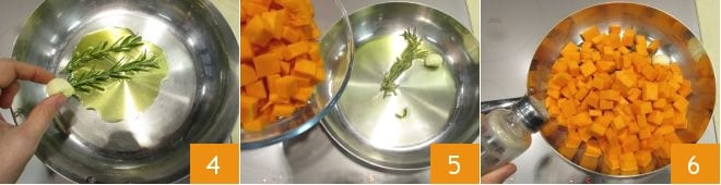 Prenez une poêle adaptée à la cuisson au four (ou utilisez une poêle antiadhésive et transférez le tout dans un plat), chauffez l'huile d'olive, ajoutez les brins de romarin et la gousse d'ail 4 et faites-les dorer à feu moyen pendant 5 minutes. À ce stade, ajoutez les cubes de courge 5, salez et poivrez à votre goût 6 et laissez cuire environ 15 minutes en remuant de temps en temps.