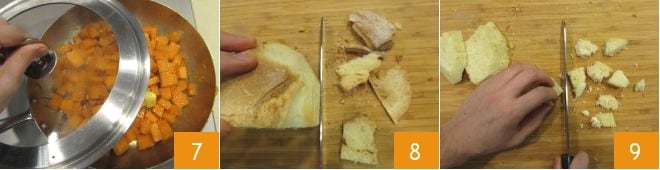 Quand il reste 5 minutes de cuisson, baissez le feu et couvrez la poêle avec le couvercle 7. Une fois que la courge est cuite, retirez l'ail et le romarin de la poêle. Préchauffez maintenant le four à 190° en mode ventilé et passez à la préparation de la chapelure : prenez le pain rassis, retirez la croûte avec un couteau 8 et coupez la mie en cubes 9 : vous en aurez besoin de 50 g.