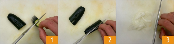Pour préparer les courgettes savoureuses à la poêle avec oignon, commencez par nettoyer et couper les légumes : retirez la partie interne des courgettes 1, puis découpez-les en bâtonnets de 6 cm de long et d'environ 1 cm d'épaisseur 2. Émincez finement les oignons 3.