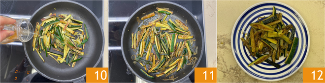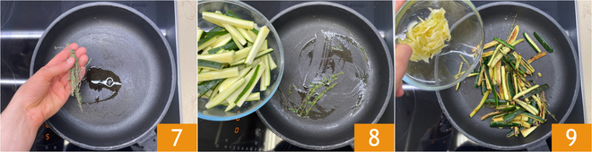 Tamponnez la même poêle avec du papier absorbant et chauffez un autre filet d'huile avec les brins de thym 7. Ajoutez les courgettes 8 et faites-les revenir à feu vif pendant 7-8 minutes. Lorsqu'elles sont bien dorées, salez et ajoutez les oignons ramollis 9.