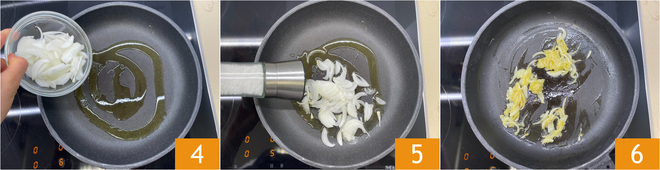 Chauffez un filet d'huile dans une poêle, ajoutez les oignons 4 et salez 5, puis faites cuire à feu moyen-doux pendant environ 10 minutes. Une fois qu'ils sont ramollis 6, mettez-les de côté dans une assiette.