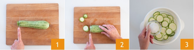 Pour préparer les courgettes en beignet, commencez par celles-ci. Après les avoir rincées et séchées, enlevez les extrémités 1 et coupez-les en rondelles assez fines 2. Placez-les dans une passoire et saupoudrez-les de sel : laissez-les reposer pendant 30 minutes, de cette façon elles perdront une partie de leur eau de végétation 3.