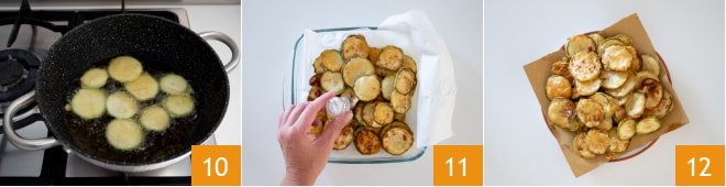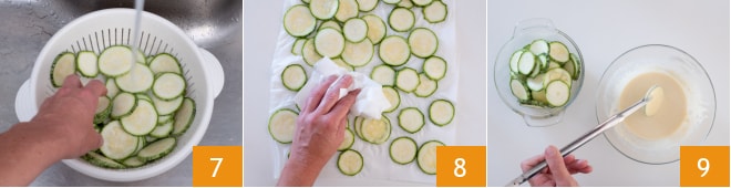 Rincez bien les courgettes 7 et étalez-les sur un torchon propre ou sur du papier absorbant. Tamponnez-les pour bien les sécher 8. Faites chauffer l'huile dans une poêle et lorsque celle-ci a atteint la température de 170°, plongez quelques tranches de courgette dans la pâte 9.