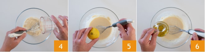 Préparez la pâte en versant la farine dans un bol. Ensuite, ajoutez l'eau très froide en filet, tout en mélangeant avec un fouet pour éviter les grumeaux, vous obtiendrez ainsi une consistance lisse et souple 4. Pressez les gouttes de citron 5 et versez une cuillère à soupe d'huile d'olive extra vierge 6.