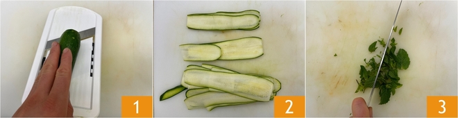 Pour préparer les courgettes marinées crues, commencez par laver les courgettes, les équeuter et bien les sécher. Coupez-les en fines tranches dans le sens de la longueur avec une mandoline 1 2. Lavez et hachez la menthe 3