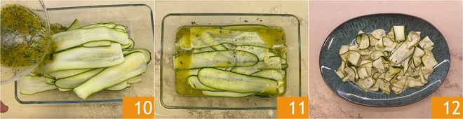 Transférez les courgettes dans un plat et versez la marinade par-dessus 10 11. Couvrez avec du film plastique et laissez reposer au réfrigérateur pendant au moins une demi-heure. Passé ce temps, retirez l'ail, égouttez bien la marinade et servez vos courgettes marinées crues à température ambiante 12 !