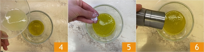 Versez dans un bol l'huile et le jus filtré du citron 4, puis salez 5 et poivrez 6.