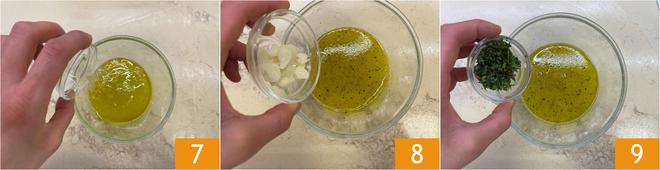 Ajoutez également le vinaigre de cidre 7, les gousses d'ail coupées en petits morceaux 8 et la menthe hachée 9. Mélangez avec un fouet pour bien amalgamer le tout.