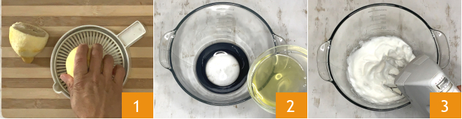 Pour préparer le gâteau au citron, commencez par râper le zeste de 2 citrons puis pressez le jus; vous en aurez besoin d'environ 120 ml 1. Séparez ensuite les jaunes des blancs d'œufs, versez ces derniers dans un bol 2 et montez-les en neige avec 20 g de sucre 3, puis réservez.