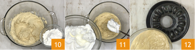 Ajoutez également la fécule de maïs 10 et la levure chimique et continuez à travailler avec les fouets pour rendre le mélange homogène. Enfin, ajoutez les blancs en neige 11 et mélangez délicatement pour les incorporer sans les faire retomber. Versez la pâte obtenue dans un moule à gâteau de 24 cm de diamètre que vous aurez préalablement beurré 12. Faites cuire dans un four statique préchauffé à 180° pendant environ 50 minutes; si elle doit trop brunir en surface, après 30 minutes, vous pouvez la couvrir d'une feuille de papier d'aluminium.