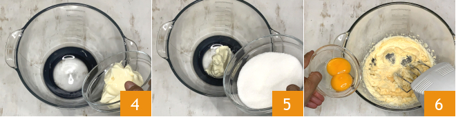 Dans un autre bol, mélangez le beurre 4 et 200 g de sucre 5 et travaillez avec les fouets pendant environ 5 minutes, puis ajoutez les jaunes, un à un, en gardant les fouets en marche 6.