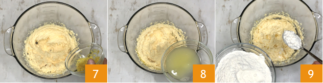 À ce stade, ajoutez le zeste 7 et le jus de citron 8 et mélangez pendant une autre minute, puis incorporez la farine, une cuillère à la fois 9.