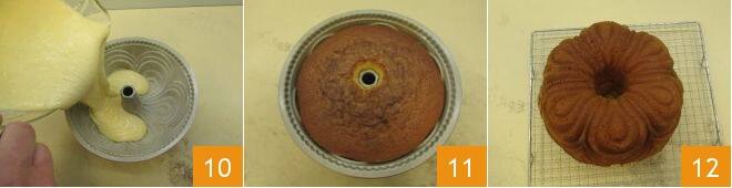 Beurrez et farinez un moule à couronne de 24 cm de diamètre, remplissez-le avec la pâte obtenue 10 et enfournez dans un four statique préchauffé à 170° pendant 60 minutes sur la grille la plus basse du four. Si la couronne devait trop foncer à la surface, couvrez avec une feuille de papier aluminium et continuez la cuisson. Après avoir vérifié la cuisson avec un cure-dent, sortez la couronne du four 11, laissez-la refroidir et démoulez-la sur une grille 12. Votre gâteau au yaourt est prêt à être dégusté !